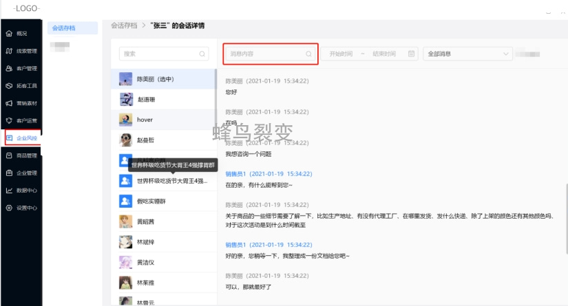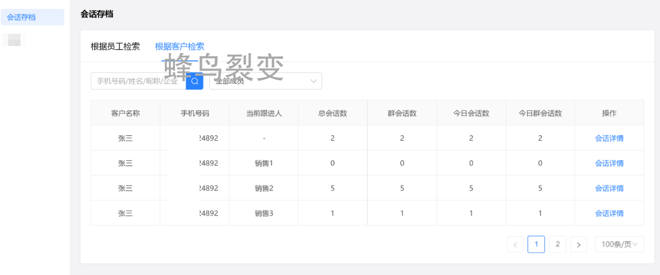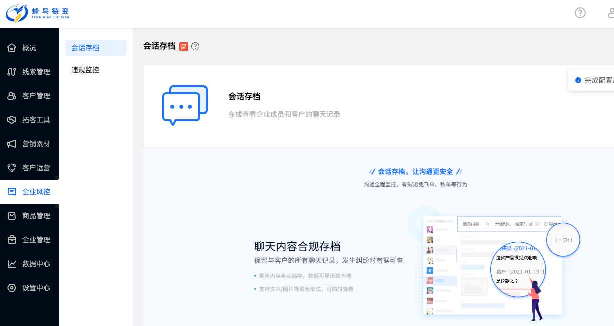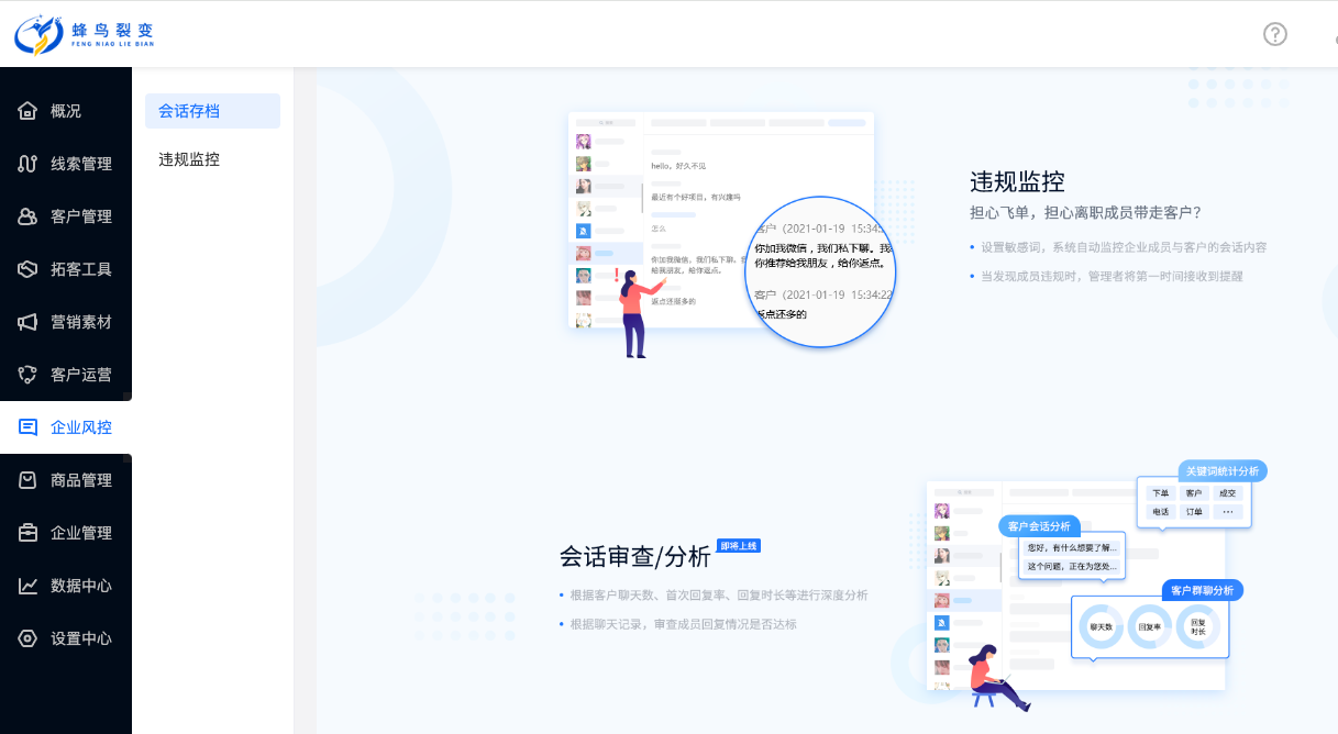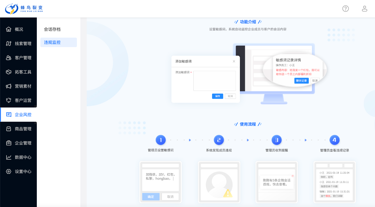 企微会话存档-企业管理者可以更好的管控企业员工与客户的销售过程,会话存档及违规词监控功能集成到蜂鸟裂变销售系统内。可将员工与客户会话的文字、图片等记录长期保存下来,可随时调取查看,保护企业与客户的相关利益。