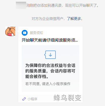 如果企业成员开启了会话存档,该成员添加客户后,就会给客户发送一个小程序告知聊天记录会被保存,默认客户同意,如果客户不同意可以进入小程序更改选择,如果客户选择不同意则不会保存客户发送的消息。