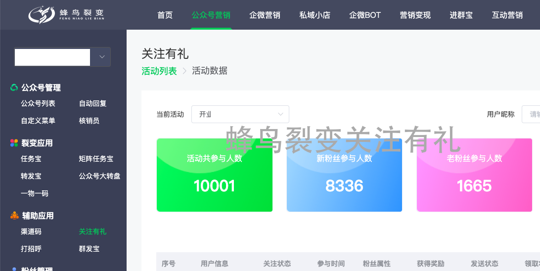 使用的系统:蜂鸟裂变SAAS系统(公众号营销-关注有礼)