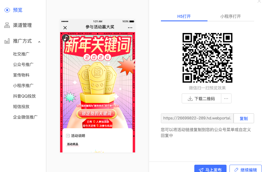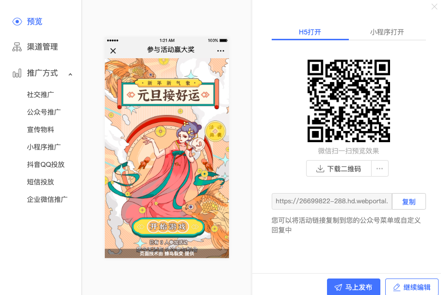 活动类型:H5游戏抽奖营销,开启粉丝专属引流到公众号
