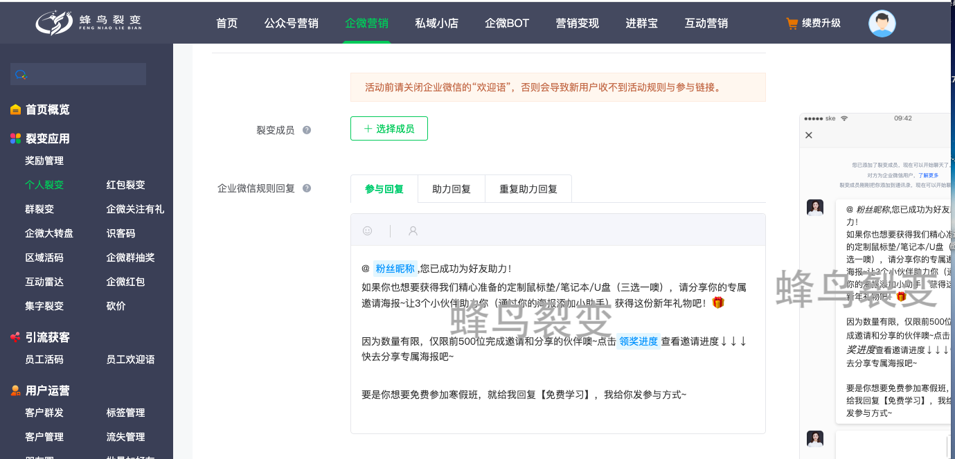 裂变工具:蜂鸟裂变-裂变营销系统-企微营销-个人裂变